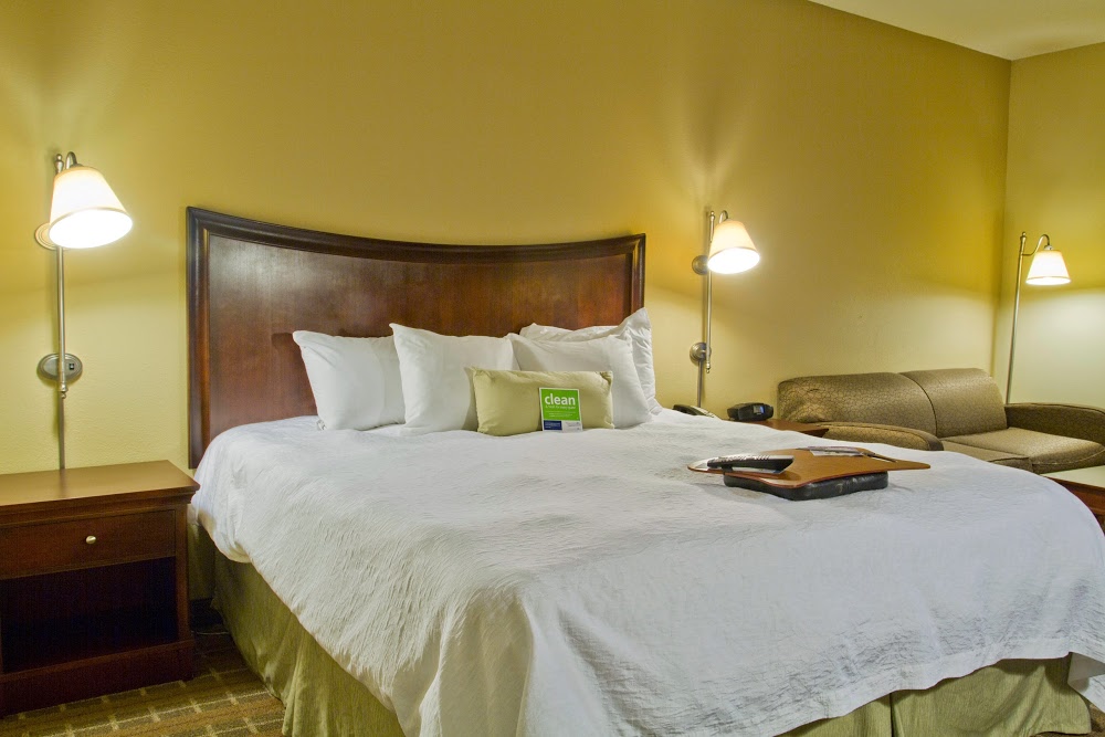 I was in town 2 nights for a work trip and stayed at both the Hampton and the Holiday Inn, so this will be a comparative review. The Hampton was superior in every way. The room was considerably cleaner at the Hampton; nothing was dirty, messy, or out of place and we were provided with complimentary bottles of water. The layout of the room was spacious with a king bed. The bed itself wasn't particularly comfortable, but the sheets seemed fresh and clean. By comparison the room at the Holiday Inn was much more cramped, and there was a strange splattering of rust brown colored stains on the ceiling. My partner and I wondered if it was blood or mold or ??? The bed itself was equally uncomfortable, but at least one pillowcase was badly stained, so the room at the Holiday Inn was not up to par with the Hampton. The Hampton also offered a much more varied and exciting breakfast including fresh waffles! All the Holiday Inn had to offer was a selection of cereals, packaged mufins, yogurt, and really terrible fake eggs. Most importantly though, we were double charged at the Holiday Inn and treated rudely when we tried to resolve it. The Hampton checked us out correctly and all of their employees treated us kindly. If you are staying in Monroe I highly recommend you choose the Hampton.